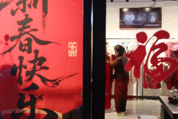 店主在兰州市七里河区兰州老街一家旗袍店内整理旗袍(1月6日摄)。新华社发
