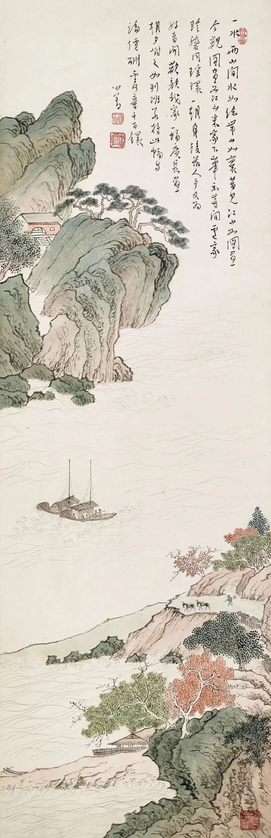 溥儒这幅《浔江客舟》,乍看是幅山水画,细品却像在和古人唠嗑。画里一水两山,水像白练,山像圆环,题诗里直接甩出一句“昔见江山如图画,今观图画如江山”——好家伙,这不就是古代版“艺术源于生活又高于生活”吗?溥儒这是在问:到底是自然美,还是画更美?